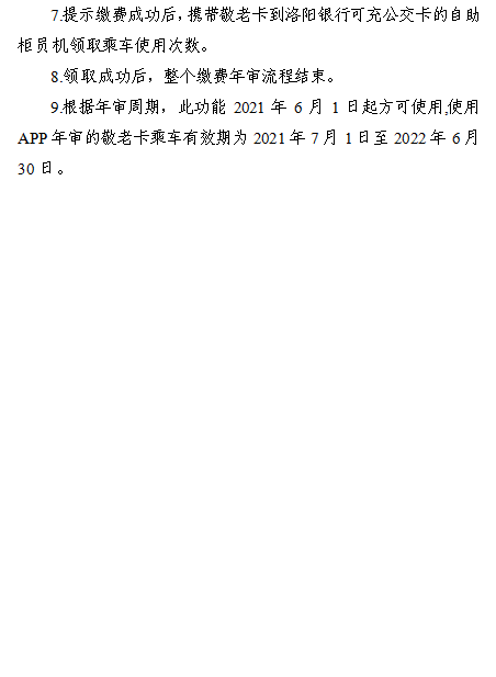 2.个人自行年审(实体卡):手机下载洛阳公交敬老卡年审专用APP(可在线添加洛阳银行卡缴纳敬老卡年度保险费,家人可代办),在线缴纳乘车意外伤害保险费10元后,持敬老卡到洛阳银行设有公交卡充值的自助柜员机领取乘车使用次数,即可正常使用,操作流程见附件2。
